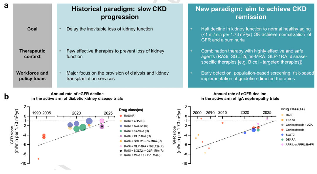 **Referência:** Tangri N, Neuen BL, Cherney DZ, Tuttle KR, Perkovic V. From progression to remission: a new paradigm for success in chronic kidney disease. Kidney International. 2025. \[**[link](https://linkinghub.elsevier.com/retrieve/pii/S0085-2538\(25\)00847-6)**]