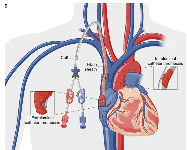 A bainha de fibrina não é só um coágulo. Ela começa como trombo e evolui para tecido com músculo liso, colágeno e endotélio. Isso cria um “tubo ao redor do cateter” que dificulta o fluxo, favorece a trombose e aumenta o risco de infecção. Além disso, biofilme e trombo se alimentam mutuamente: mais trombo gera mais infecção, que gera mais disfunção.