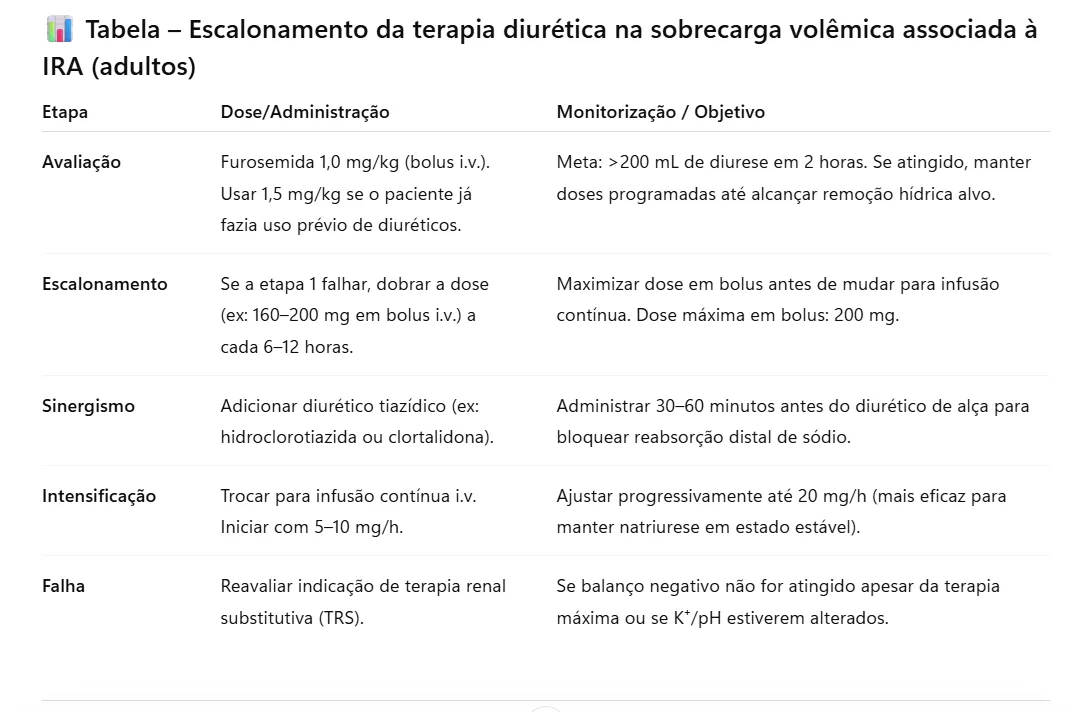 Na realidade brasileira, onde TRS frequentemente é recurso limitado e há pressão para postergar máquina, o protocolo de escalonamento com critério claro de falha é especialmente relevante. Saber a hora de parar de escalar o diurético e iniciar TRS é tão importante quanto saber quando começar o furosemida.