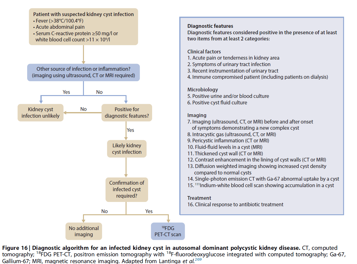Pacientes com DRPAD que apresentam febre, dor abdominal ou lombar aguda, elevação de leucócitos e/ou PCR devem ser investigados para infecção de cistos renais.