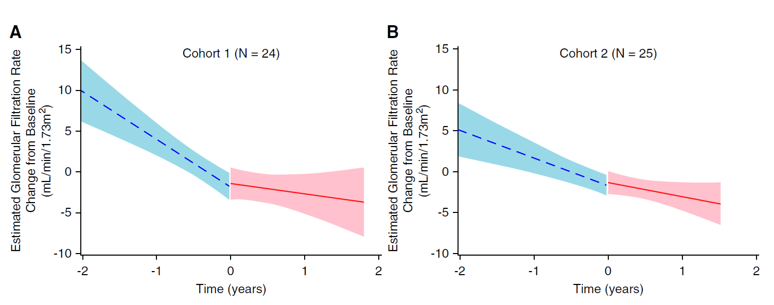 📌 Interpretação prática: em pacientes com perda acelerada de função renal, houve sinal de redução importante da velocidade de progressão.