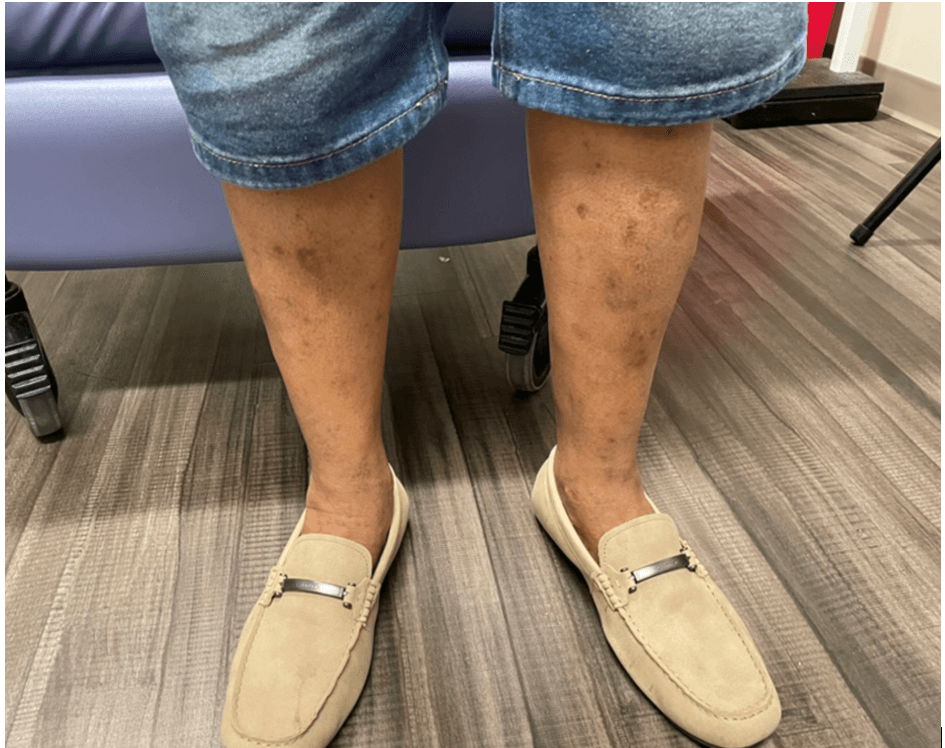 Homem de 52 anos com insuficiência renal secundária ao diabetes mellitus tipo 1, em hemodiálise, apresenta xerose generalizada nas regiões anteriores de ambas as pernas (tíbias) e tornozelos, com áreas de aspecto ictiosiforme e máculas e placas levemente hiperpigmentadas dispersas
