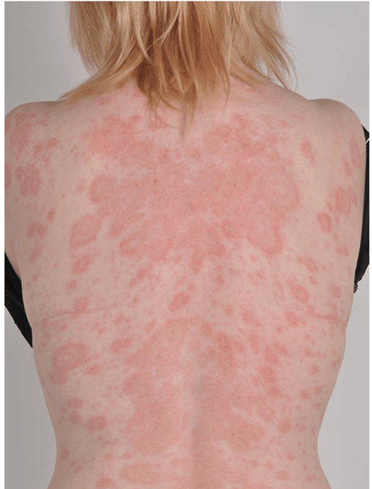 Mulher de 45 anos apresenta lesão eritematosa anular acometendo ombros e dorso.