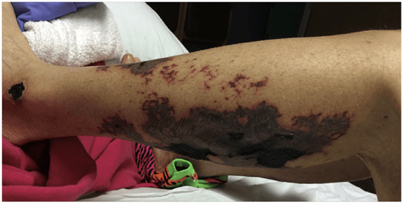 Mulher de 55 anos com insuficiência renal em hemodiálise apresenta lesão dolorosa na coxa esquerda, caracterizada por múltiplas placas com padrão de livedo reticular.