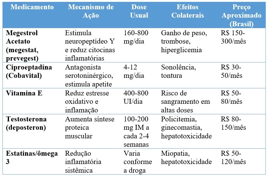A tabela a seguir apresenta as opções terapêuticas utilizadas no manejo da caquexia na DRC, incluindo disponibilidade e custos aproximados.