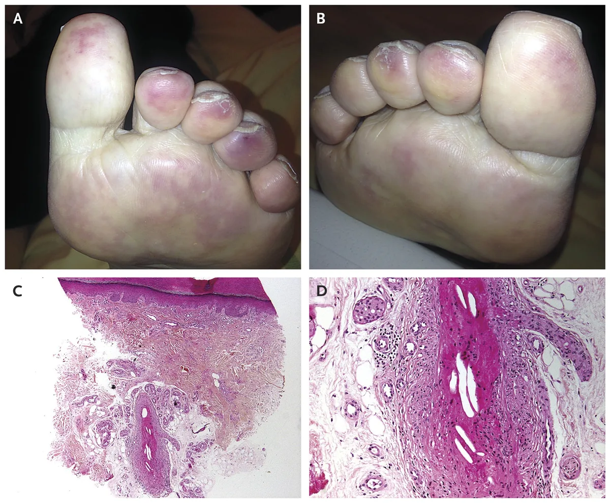 Achados clínicos e histopatológicos da embolia de colesterol. (A–B) Lesões cutâneas nos pés caracterizadas por áreas violáceas e moteadas, compatíveis com livedo reticular, associadas a coloração arroxeada dos pododáctilos (“síndrome do dedo azul”), refletindo isquemia distal por oclusão de pequenos vasos. (C–D) A biópsia de pele evidencia arteríolas com oclusão luminal por fendas alongadas e vazias, correspondentes a cristais de colesterol dissolvidos no processamento histológico, acompanhadas de reação inflamatória perivascular — achado clássico de embolia de colesterol.