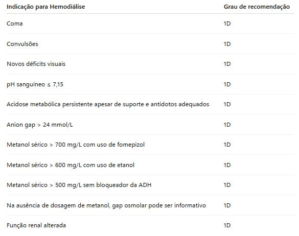 * Metanol >50 mg/dL → recomendar HD, mesmo sem acidose/lesão orgânica, pois a eliminação sob ADH inibida é muito lenta.